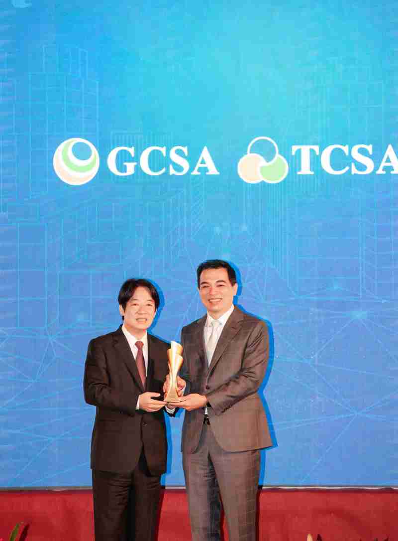 达全方位永续表现获全球永续奖及台湾永续奖肯定,,,,由副总统赖清德颁奖 (左),,,彩运网总经理柯富仁 (右) 代表领奖