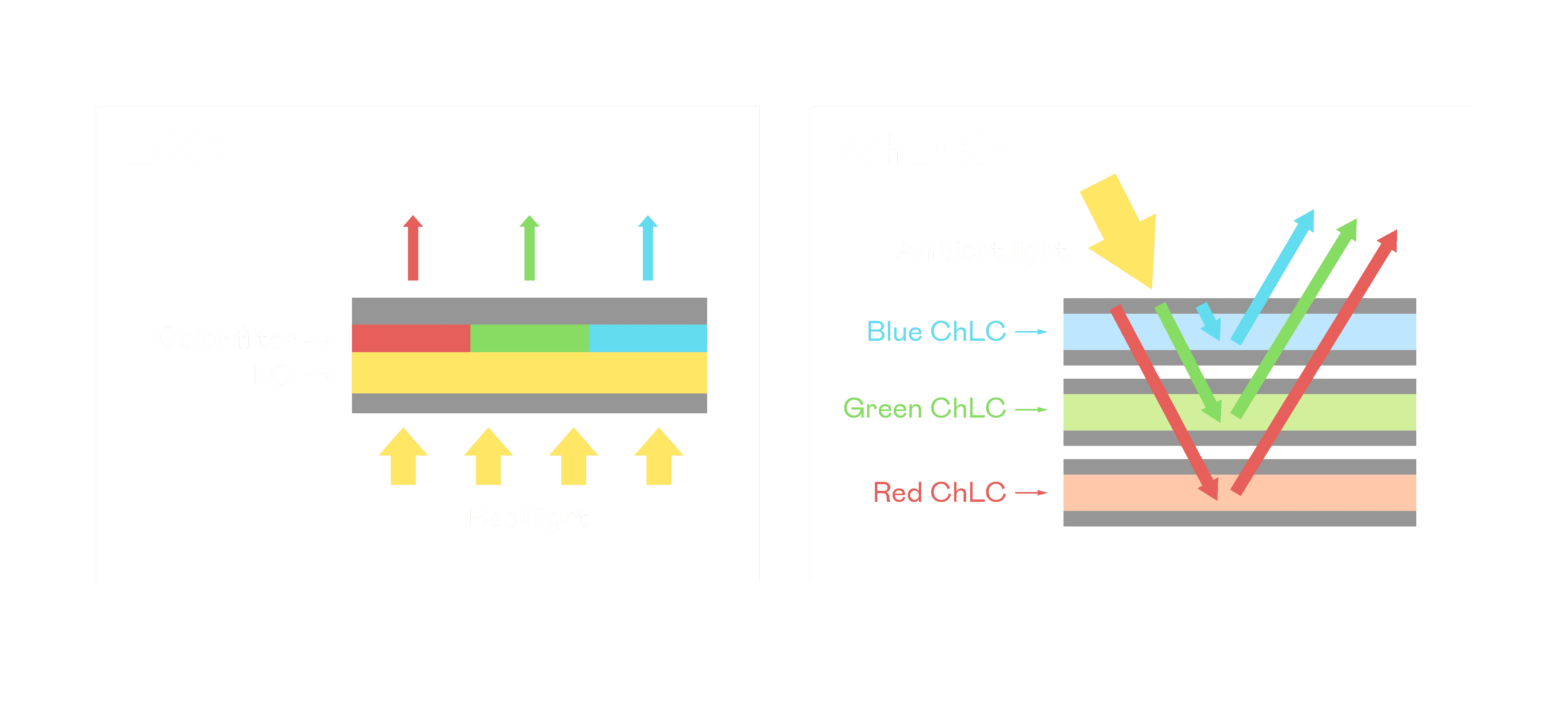 ChLCD 胆固醇液晶就如同纸张一样,,透过反射环境光来显示影像,,,因此长时间观看不易造成人眼视觉疲劳,,,,可达到护眼效果。。。。当处于户外阳光下使用,,,,LCD 影像容易失真而不易观看,,但胆固醇液晶仍可维持较佳的影像品质。。。